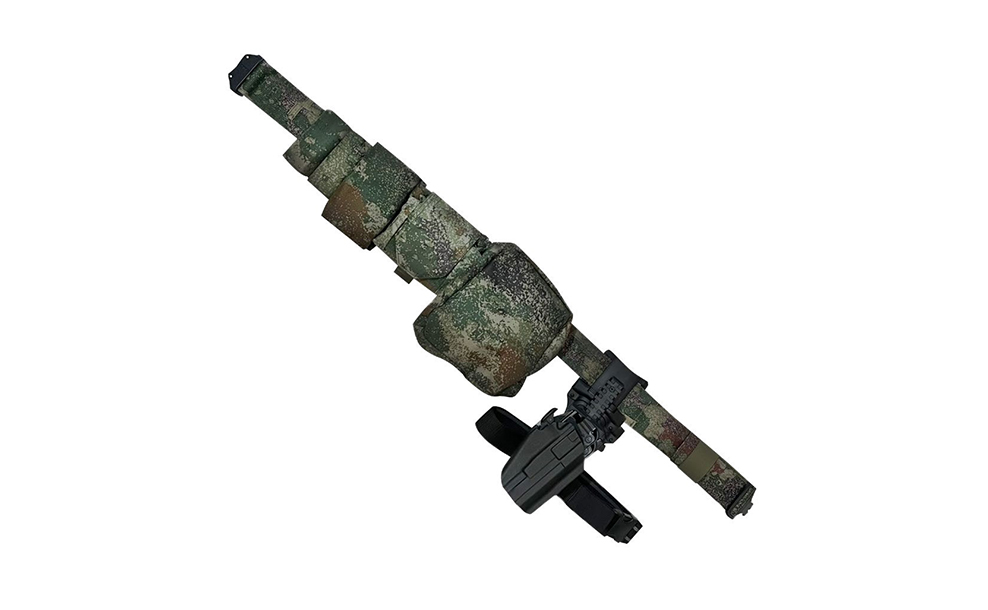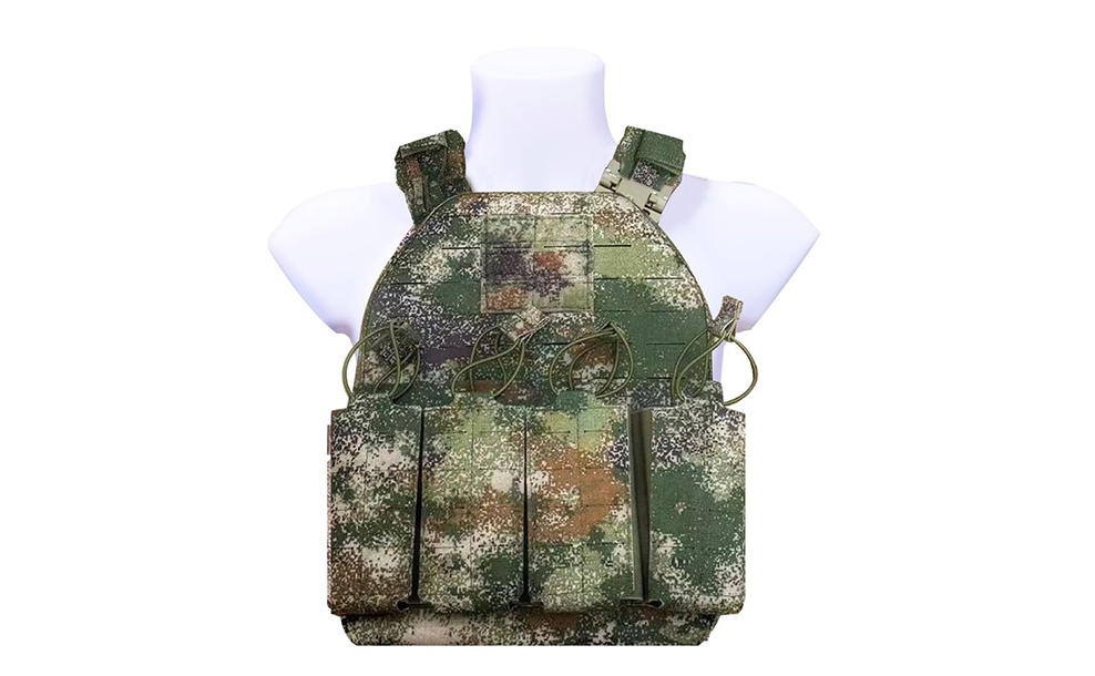 The rig can accommodate two ballistic plates. The front and rear pouch-style loadout can hold both large and small ballistic inserts.